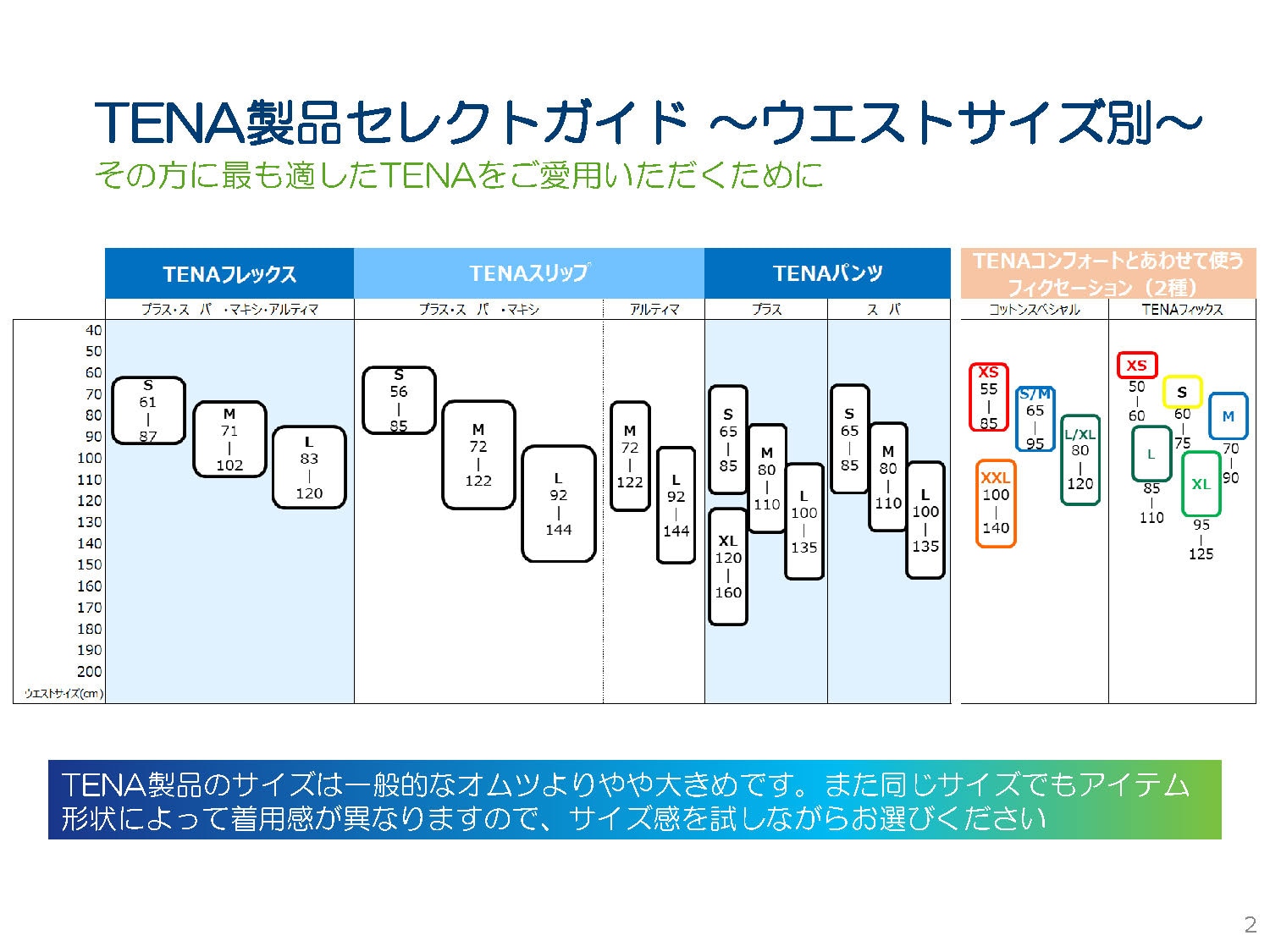 TENAは、衛生と健康の分野で世界をリードするグローバル企 業、Essityのブランドです。私たちの製品、ソリューション、サービスは、 毎日、世界中で10億人以上の方々にご利用いただいています。私た ちのパーパス(存在意義)は、消費者、患者、介護者、顧客、そして社会 全体の利益を実現するため、ウェルビーイング(身体的、精神的、社会 的なすべての面で満たされ、幸福な状態)への障壁を取り除くことで す。Essityは、TENA(テーナ)やTork(トーク)などのグローバルリーダ ーブランドに加え、Actimove、Cutimed、JOBST、Knix、 Leukoplast、Libero、Libresse、Lotus、Modibodi、Nosotras、 Saba、Tempo、TOM Organic、Zewaといった有力ブランドを展開 し、約150カ国で製品を販売しています。2024年には、Essityの純売 上高は約1,470億スウェーデンクローナ(約130億ユーロ)を達成 し、36,000人の従業員を擁しています。本社はスウェーデンのストッ クホルムにあり、ナスダック・ストックホルムに上場しています。詳細 は、www.essity.comをご覧ください。